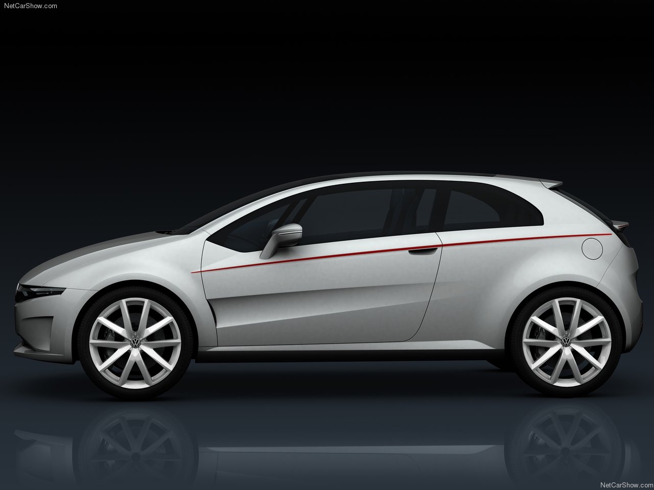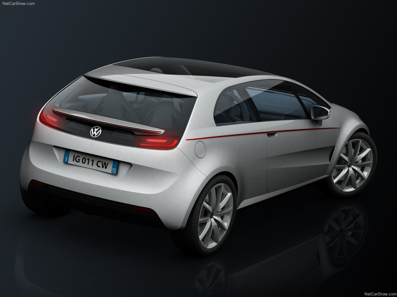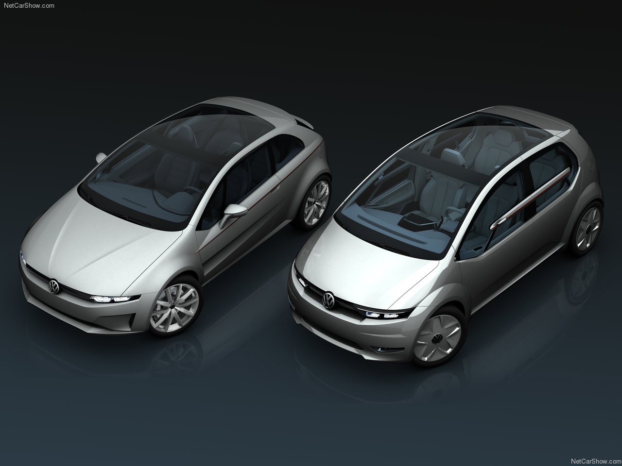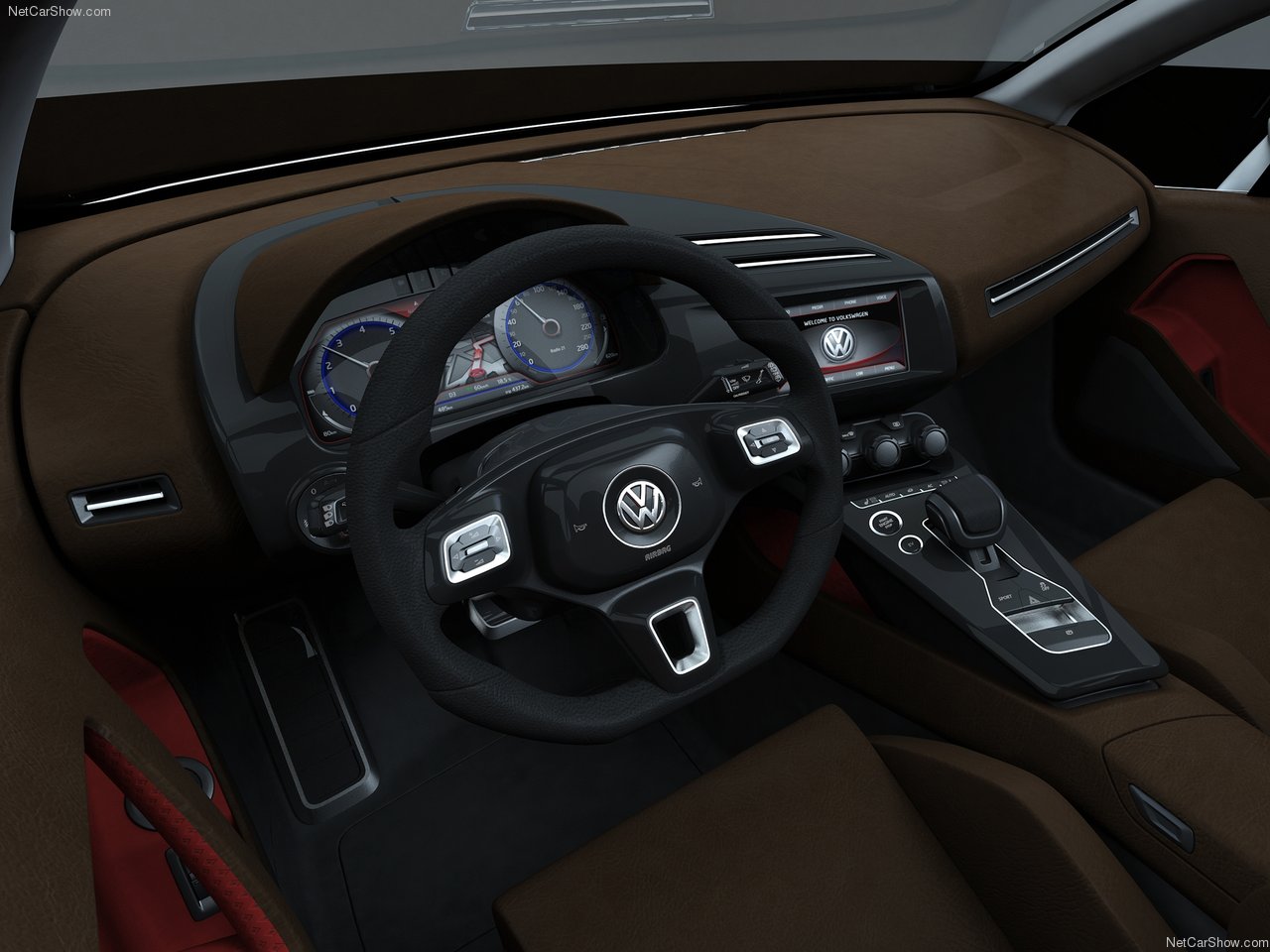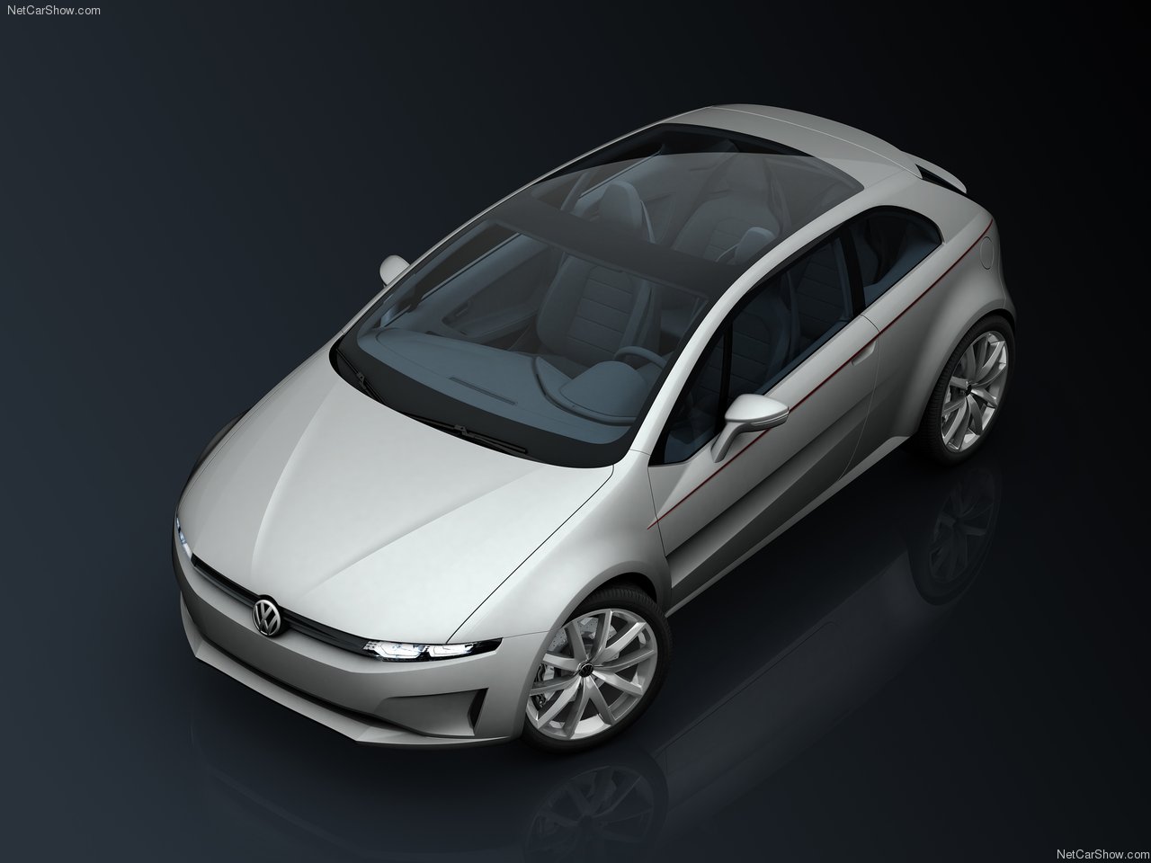 The front is distinguished by a slender grille that encloses the light clusters in an unprecedented trapezoidal shape and three air intakes in the bumper/spoiler zone, necessary for cooling the brake discs and 1.4-litre turbo engine. The VW badge sits in the centre of the grille and is optically underscored by the V-shaped groove of the bonnet. Windscreen and roof are a single piece of glass that becomes dark electronically.